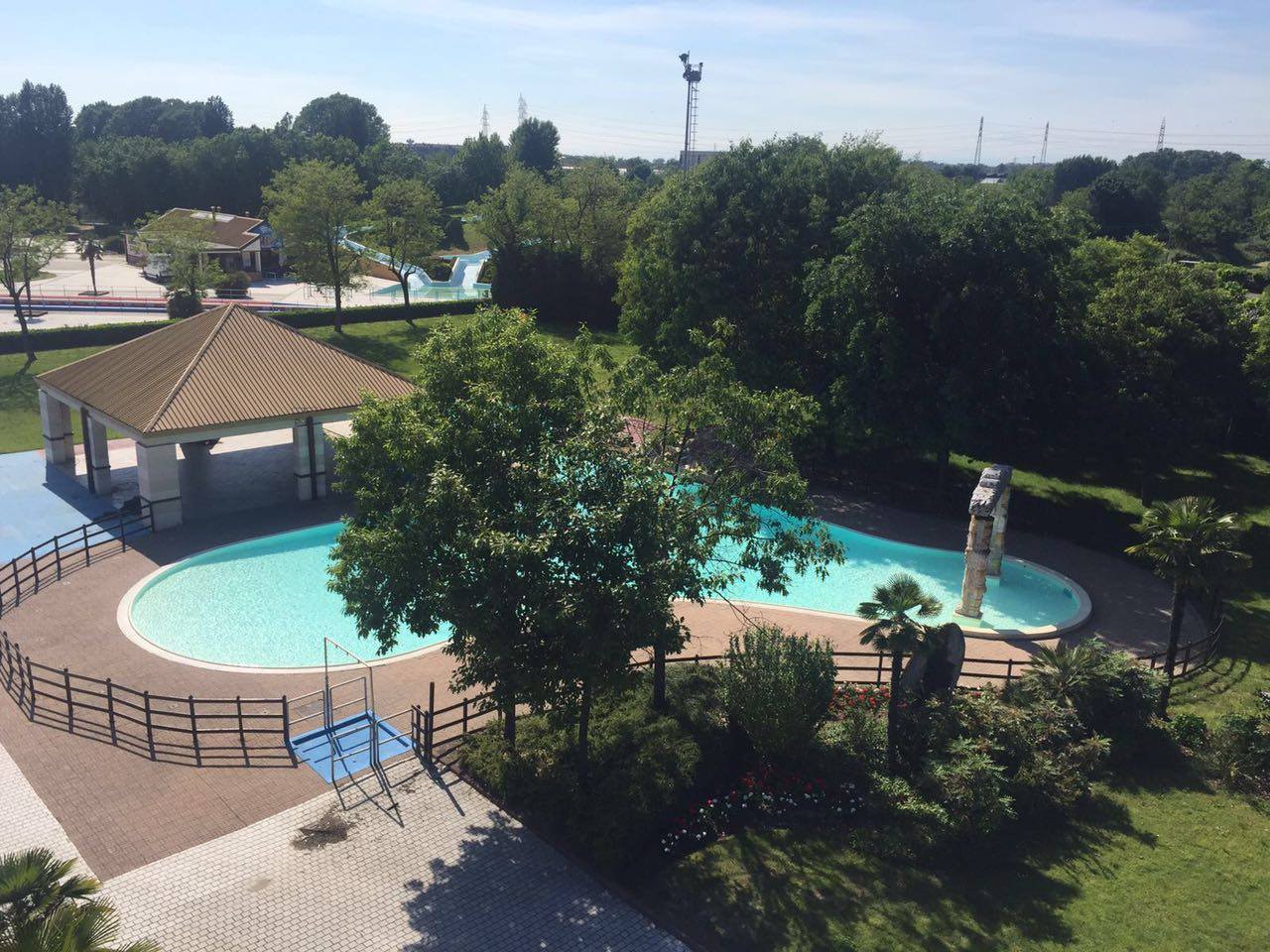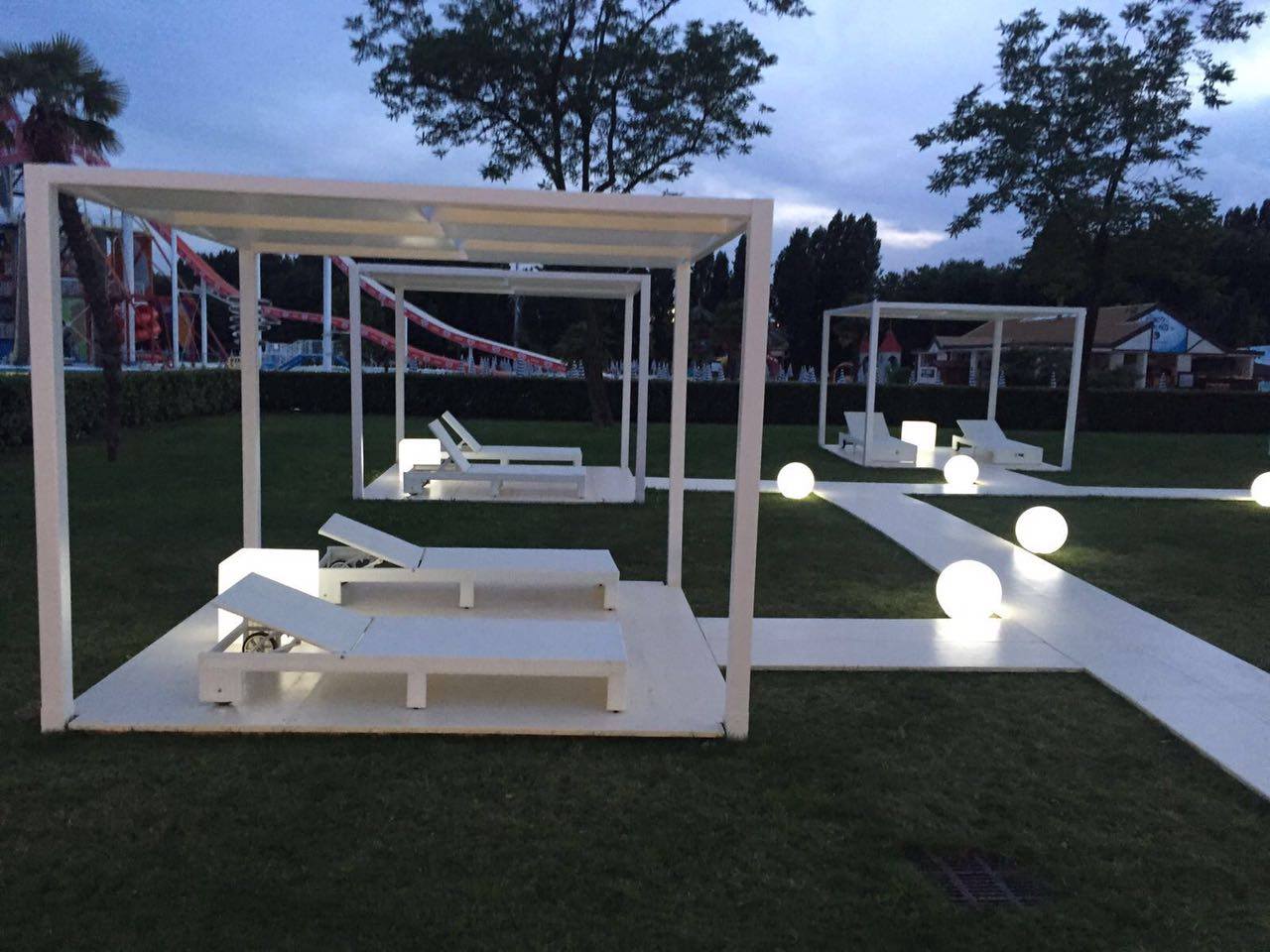 Degni di nota sono certamente i grandi gazebi dislocati su una pedana di legno che racchiude.. una piscina!