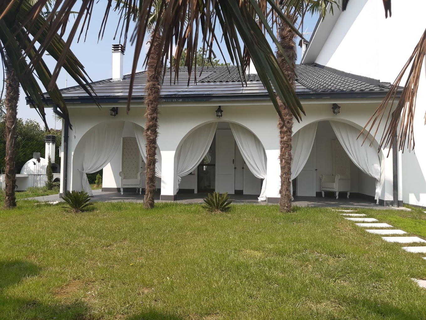 Sia frontalmengte che sul retro la villa ha due pergolati o tettoie che consentono anche di cenare in caso di pioggia.